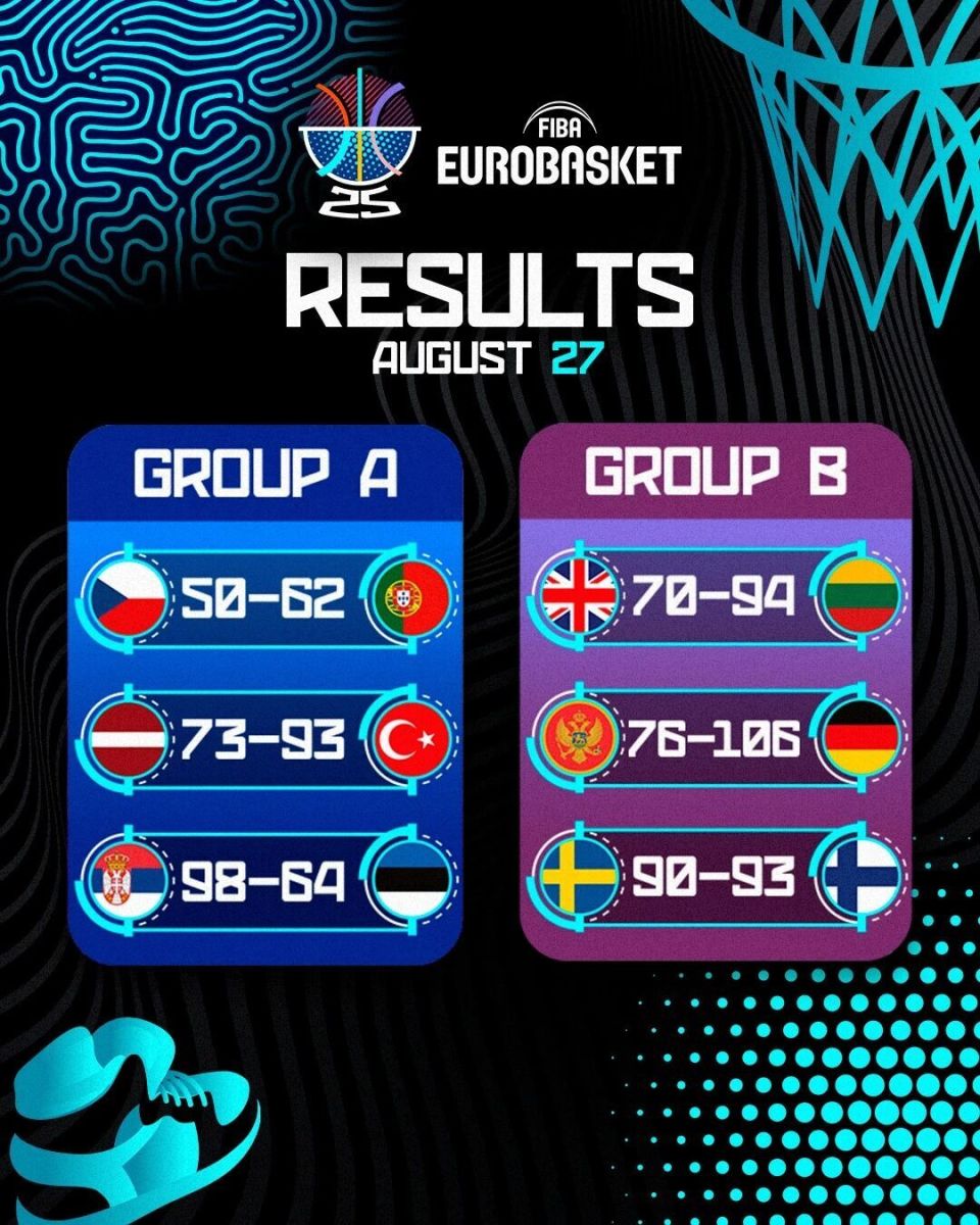 再来看看今天另外几场战况,土耳其93-73大胜东道主拉脱维亚。申京出战27分钟,12投7中,拿到16分8篮板7助攻1抢断1盖帽5失误,正负值+17。波尔津吉斯12中3,仅得10分4篮板1助攻1抢断6失误,正负值-17被申京打爆了。