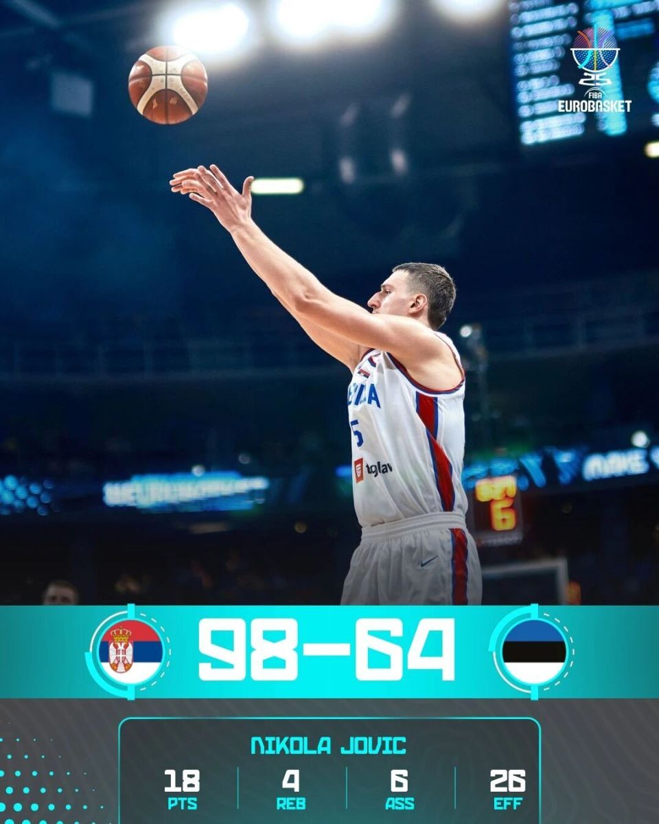 北京时间8月28日凌晨,欧洲杯小组赛:塞尔维亚98-64大胜爱沙尼亚。塞尔维亚对阵欧洲球队已经豪取16连胜,自2023年篮球世界杯决赛之后还没输过。约基奇仅出战23分钟,4投3中砍下11分10篮板7助攻,正负值+39全场最高。